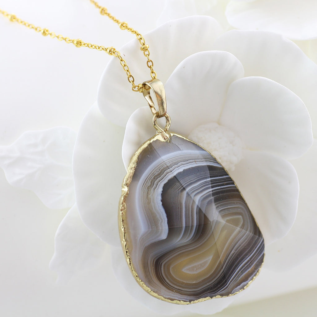 Gemstone pendant is approximately 1.5 x 3 inches. Necklace is approximately 30 inches.