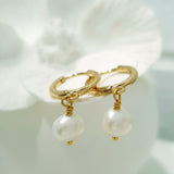 Approximately 0.45 inch drop freshwater pearls in a 0.8-inch diameter gold/silver loop. Earrings is approximately 1.6 inches drop.